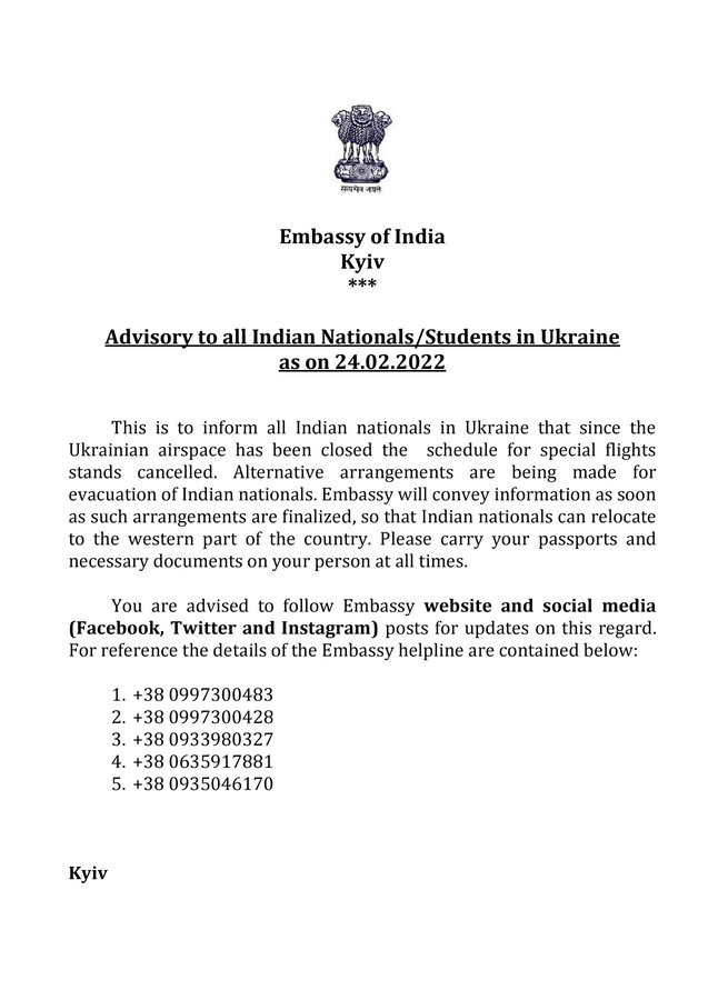 Going by a communique that has been released, the Indian embassy in Ukraine has said: “The present situation in Ukraine is highly uncertain. Please maintain calm and remain safe wherever you are, be it in your homes, hostels, accommodation or in transit.” It followed this up with afresh advisory later asking all those travelling to Kyiv, including those travelling from western parts of Kyiv, to return to their respective cities temporarily, especially towards safer places along the western bordering countries.